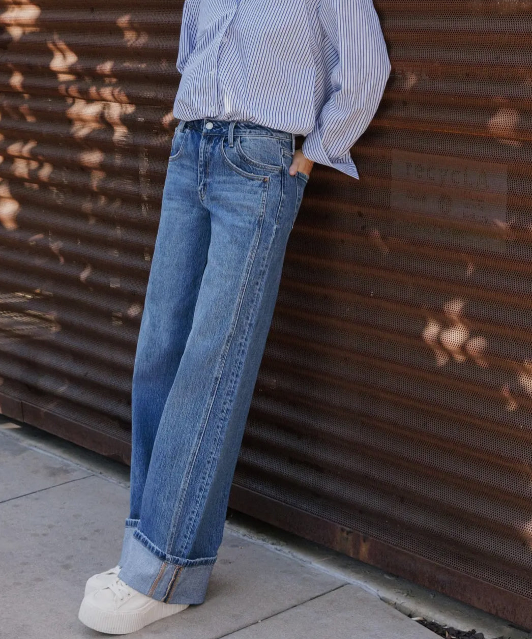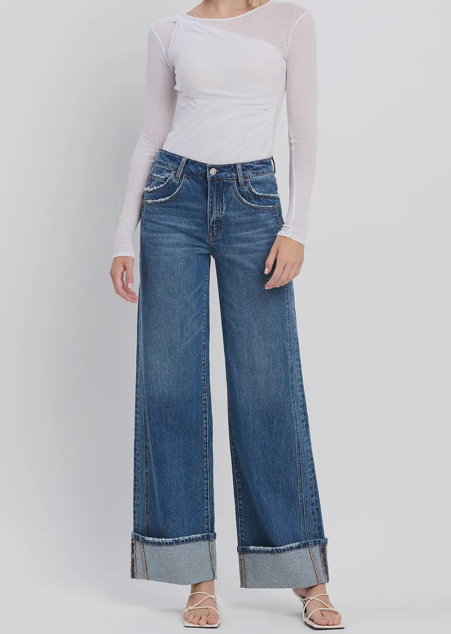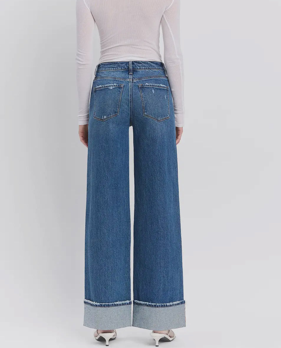 High rise cuffed panel baggy wide jeans Comfort stretch denim, high rise waist, panel detail, single cuff hem, full length, baggy wide jeans