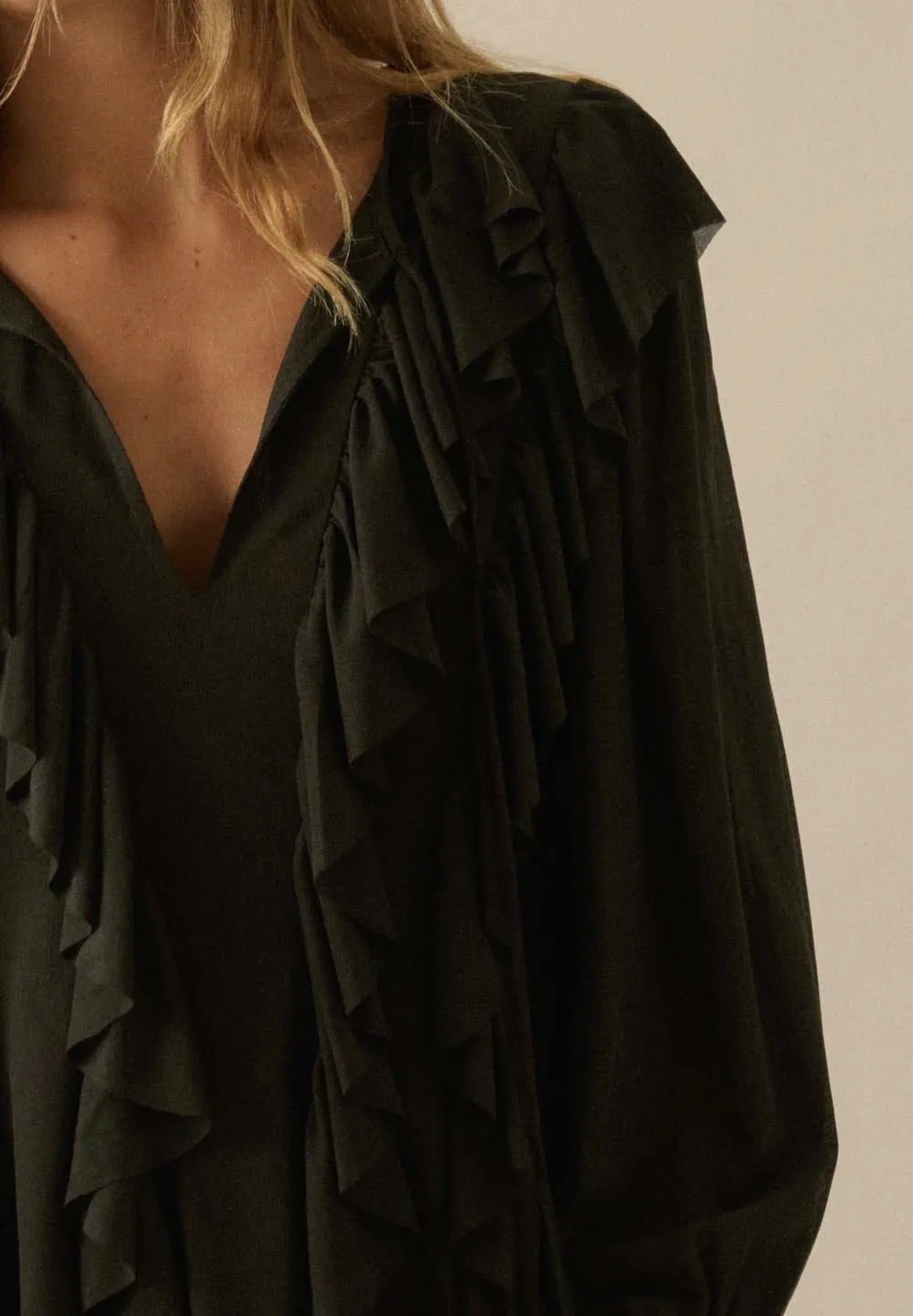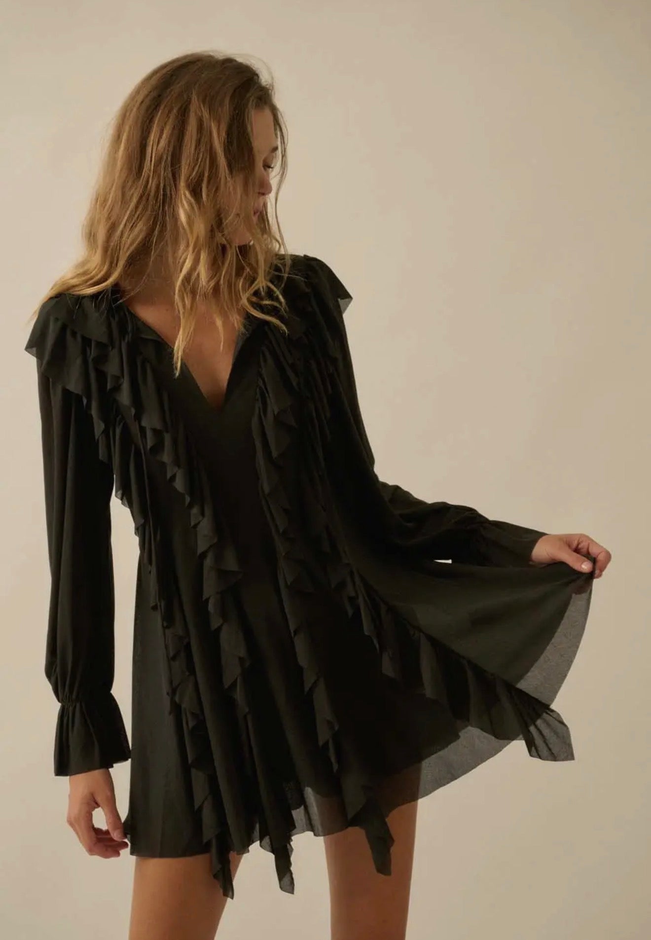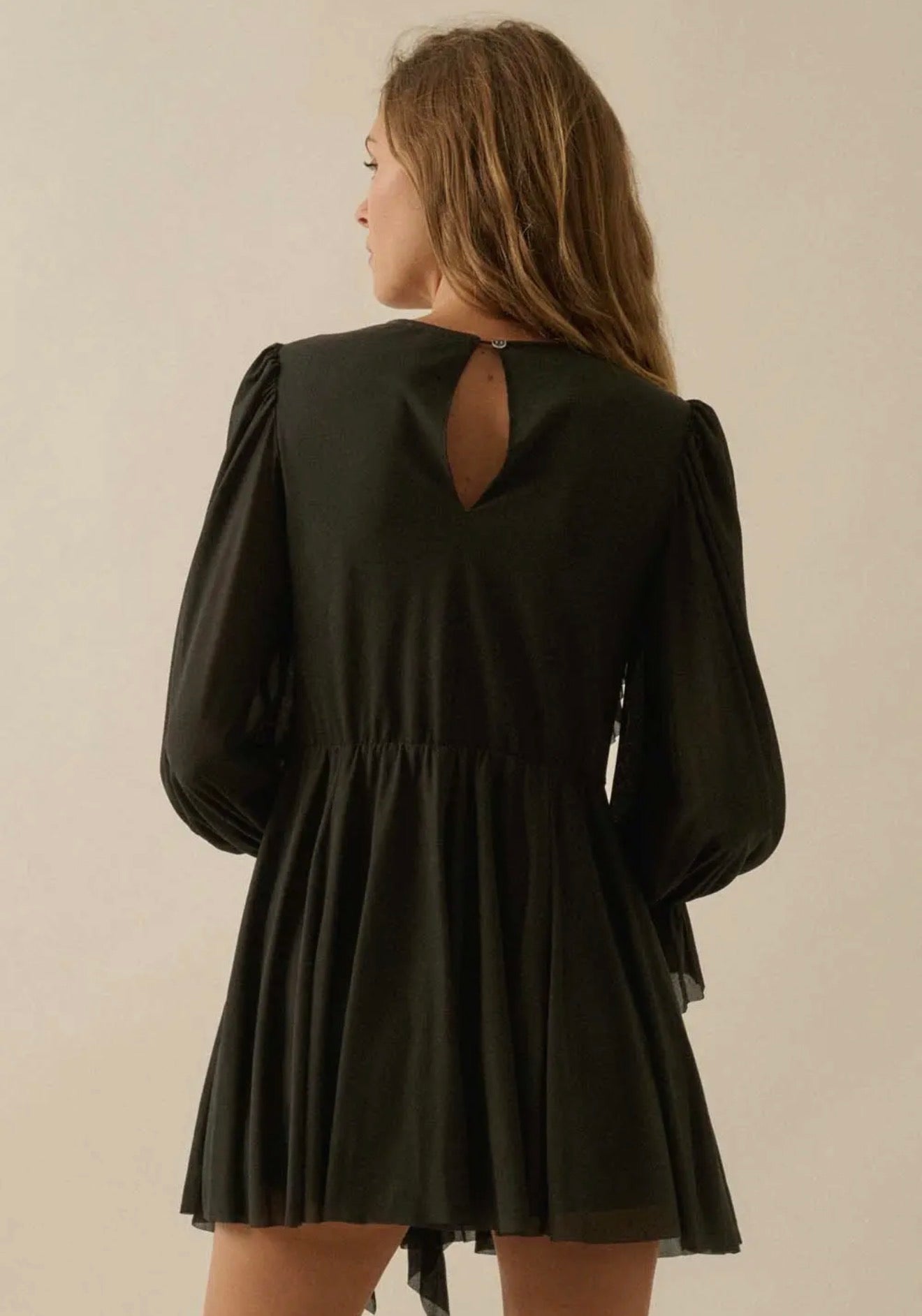 A solid knit romper with the following features: V neckline with tie closure. Cascading ruffles along the front. Long bubble sleeves with ruffle cuffs. Buttoned keyhole back closure. Shorts lining. Thigh length. Relaxed fit.