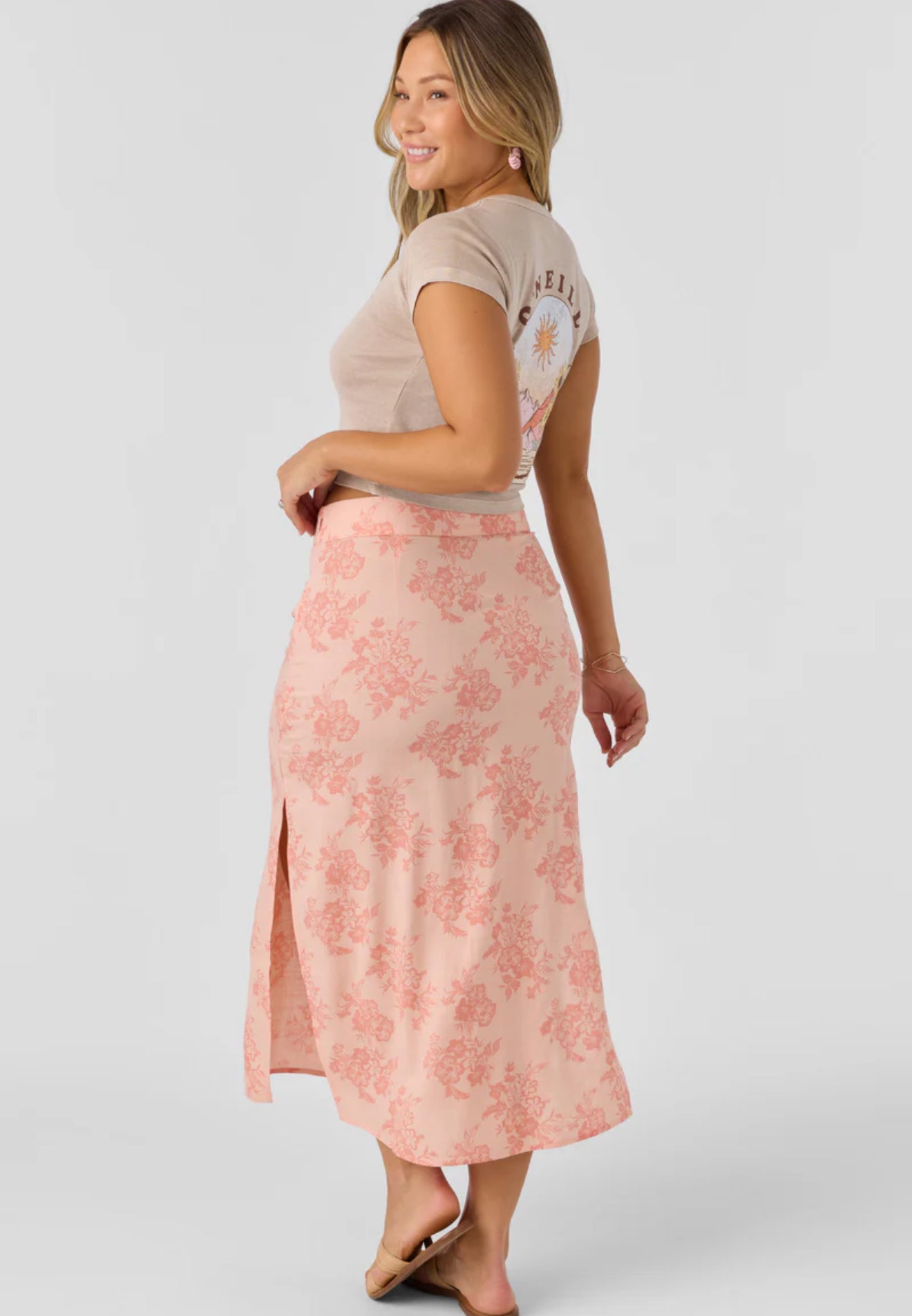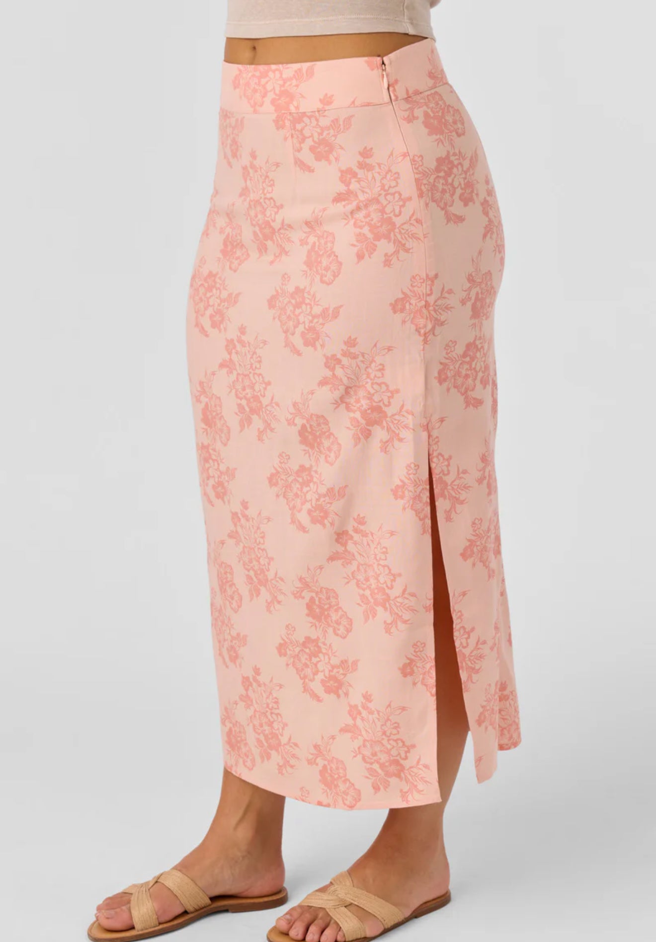 So stylish woven midi skirt that has a lightweight fabric feel, flowy fit, allover print and side slit detail.