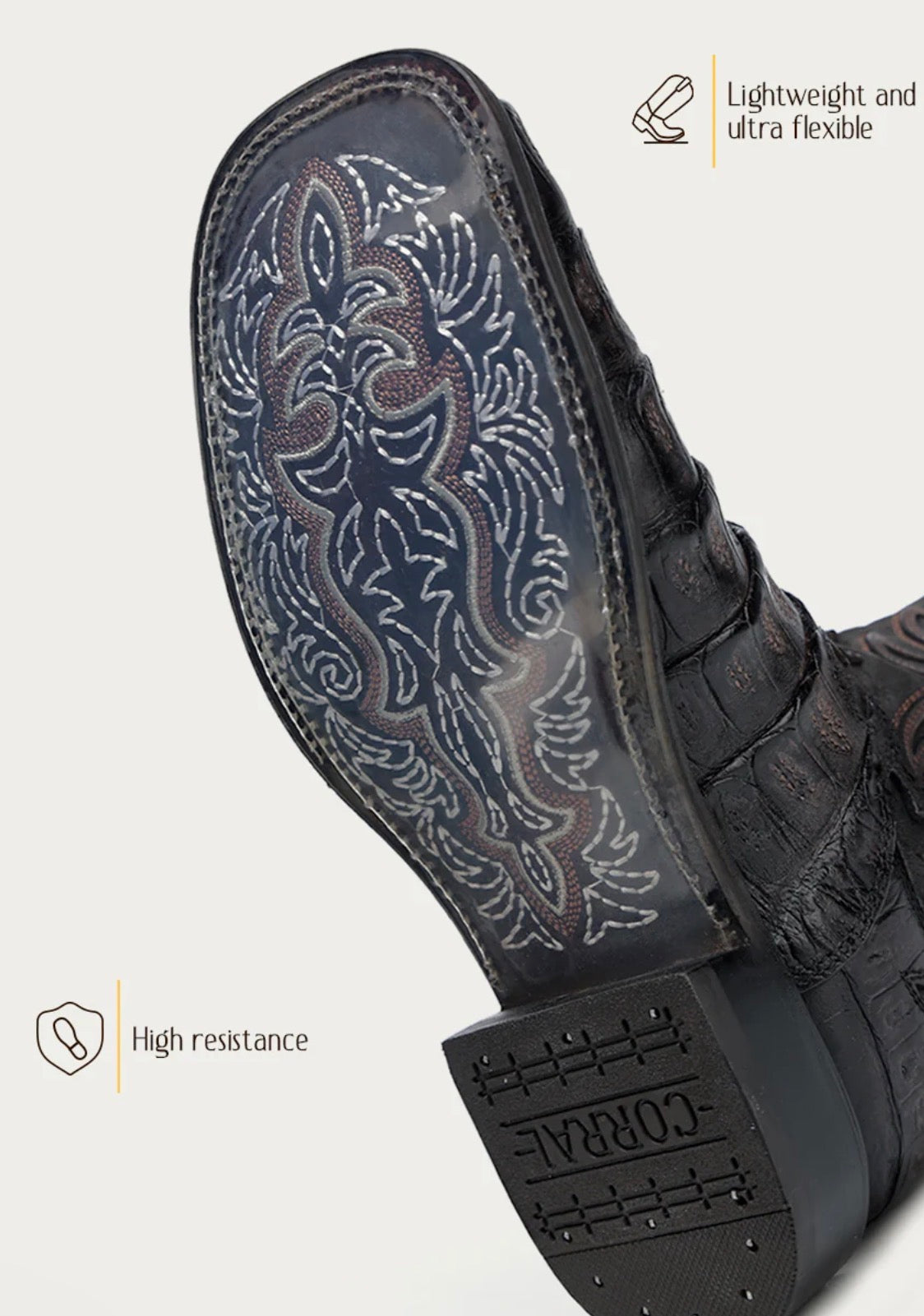 The embroidery pattern along the 12-inch shaft shows the attention to detail. This caiman boot is not only elegant but also very resistant and durable perfect for any occasion.
