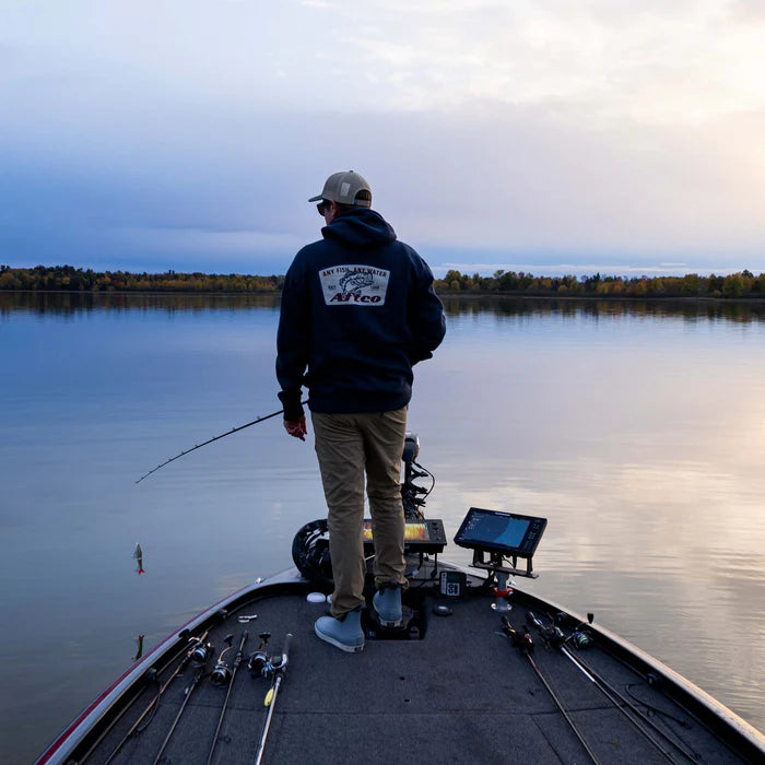 The Colossal Pullover Hoodie showcases the king of freshwater, the largemouth bass. This cozy fishing sweatshirt is ideal for chilly days, offering warmth and comfort whether you’re lounging dockside or by the fire.