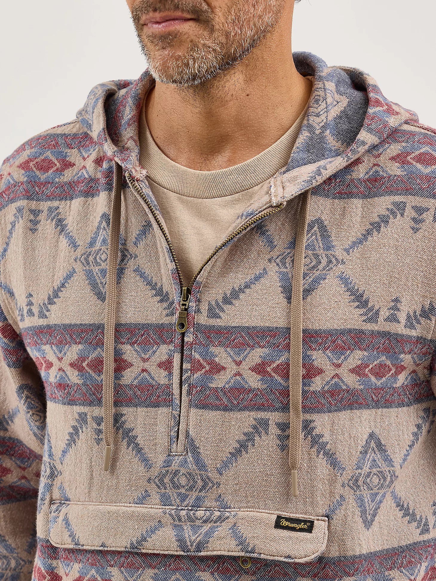 Layer up your look in style with our Men's Hooded Popover Jacket. Crafted from 100% cotton, this Western-inspired hoodie comes with a jacquard geometric design that will separate you from the pack. It also features a 1/4 zip front, a drawstring closure, welt hand pockets, and a pouch pocket that zips to keep your essentials secure.
