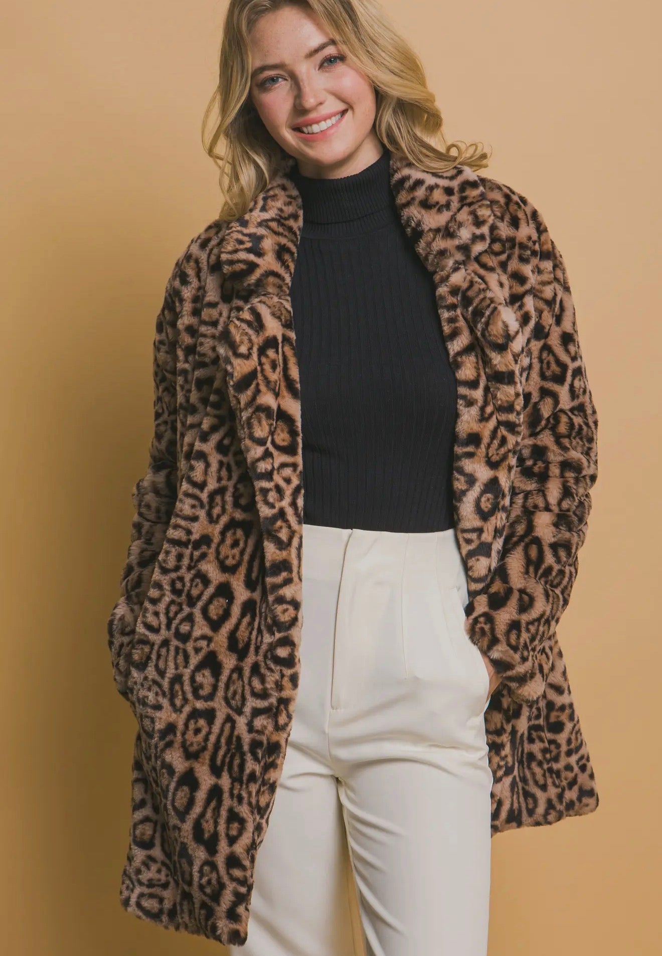 Animal Print Fur Coat w/ Pockets (100% POLYESTER)