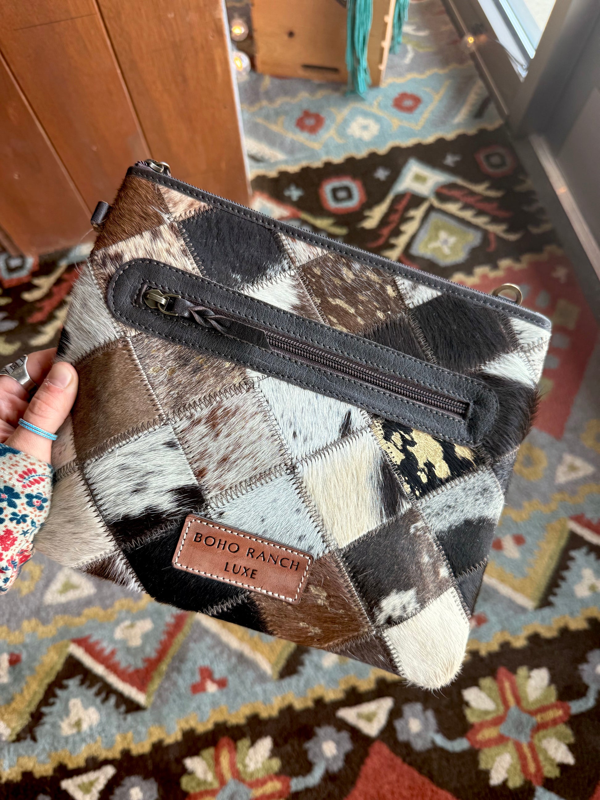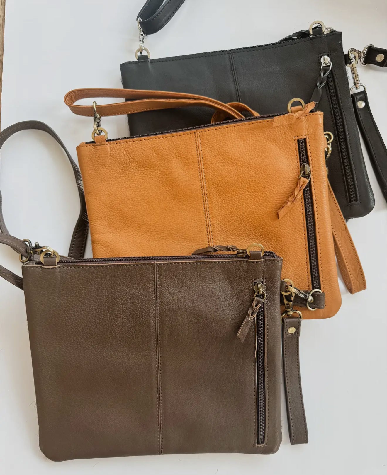 • adjustable/ removable shoulder leather strap, also comes with a removable leather wristlet, genuine premium cowhide front panel, back is all leather with zippered pocket, back zippered pocket opening 6.5” X 9”