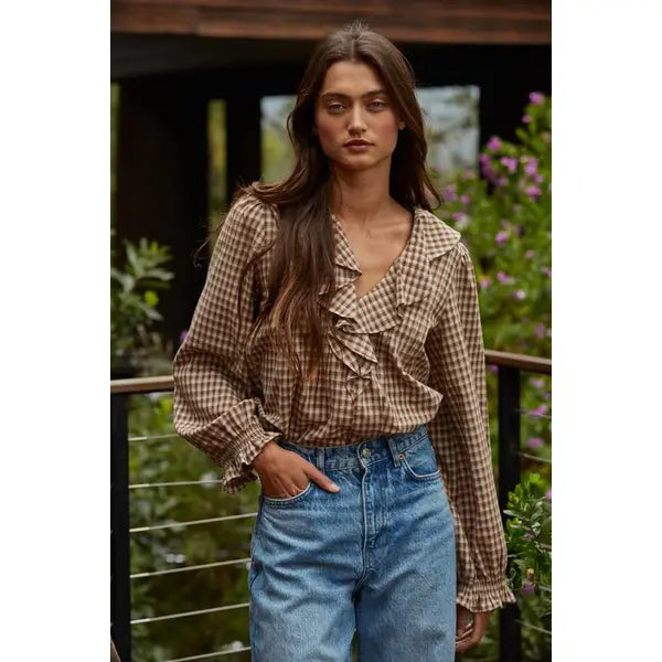 A romantic twist on a timeless classic. This gingham ruffle blouse blends soft femininity with effortless everyday style. Designed in a warm brown and cream check, it features a ruffled neckline, billowy sleeves, and a lightweight drape that moves beautifully from day to night.