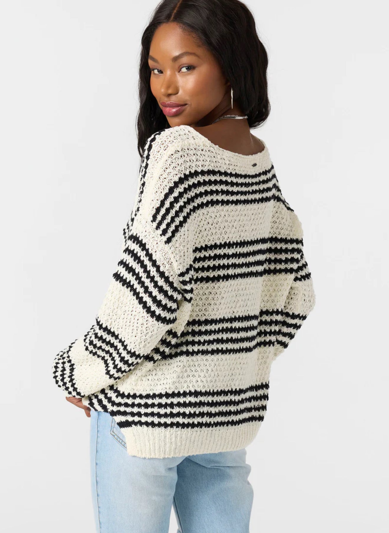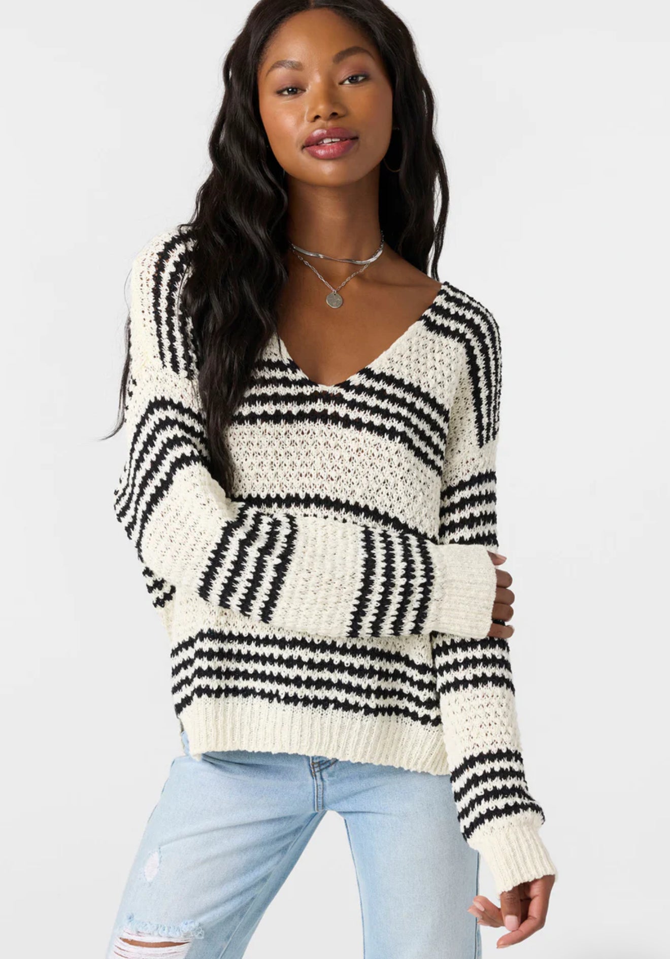 Classic stripes and cozy vibes. Stay warm in this v-neck sweater that features a drop shoulder design and hem slit detail.