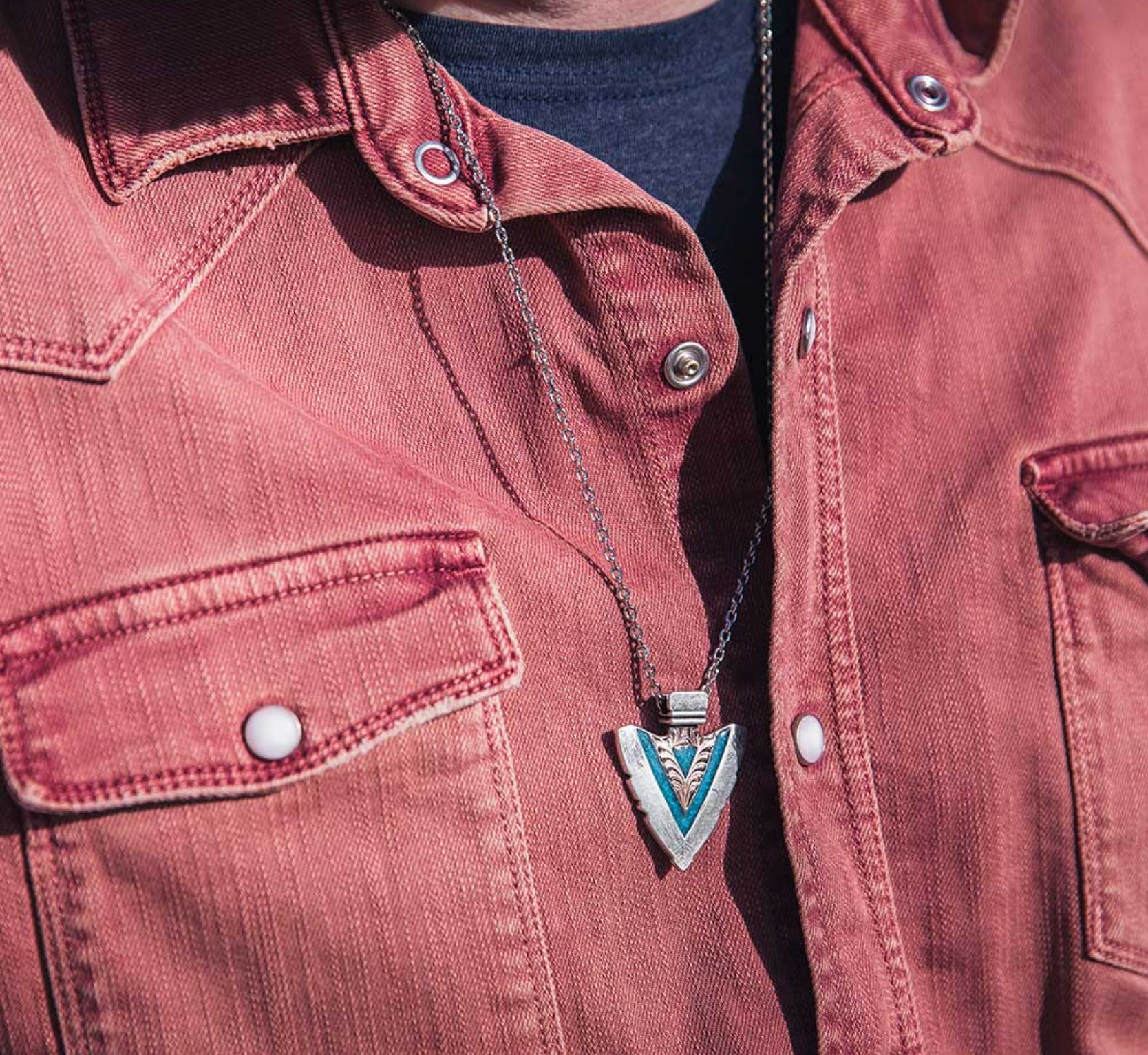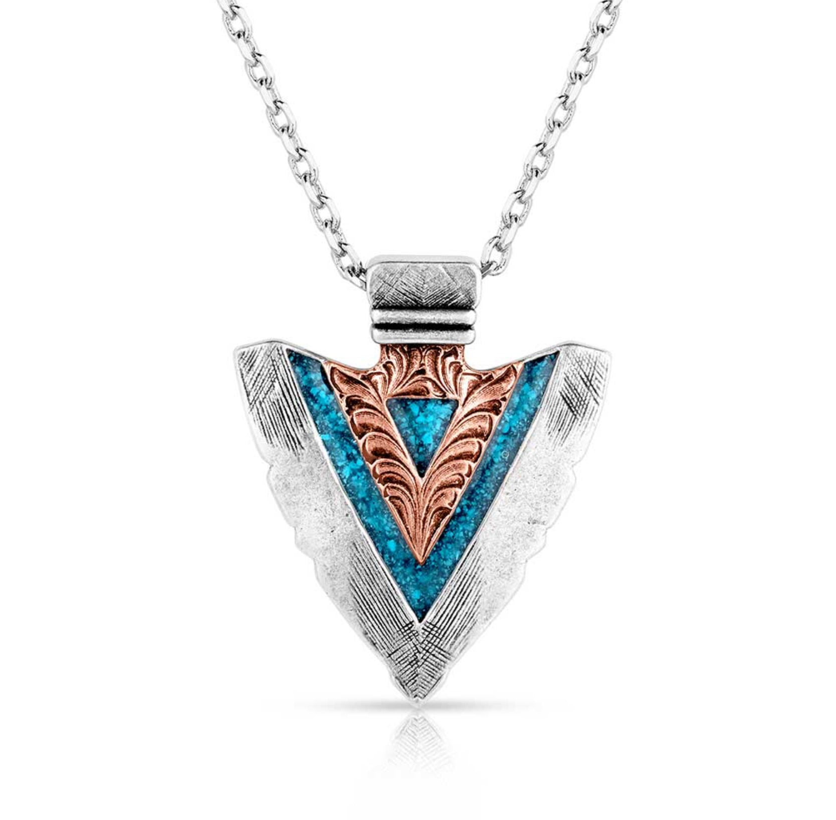 Share your inner light with the world with the Inner Light Turquoise Arrowhead Necklace. The piece features a beautiful silver tone arrowhead pendant. Inlaid turquoise highlights the design of the arrow and is contrasted by a copper tone. Another layer of turquoise outlines the smaller triangle for a distinctive look. The necklace has a 27 inch adjustable chain for easy wear. Stone color may vary.