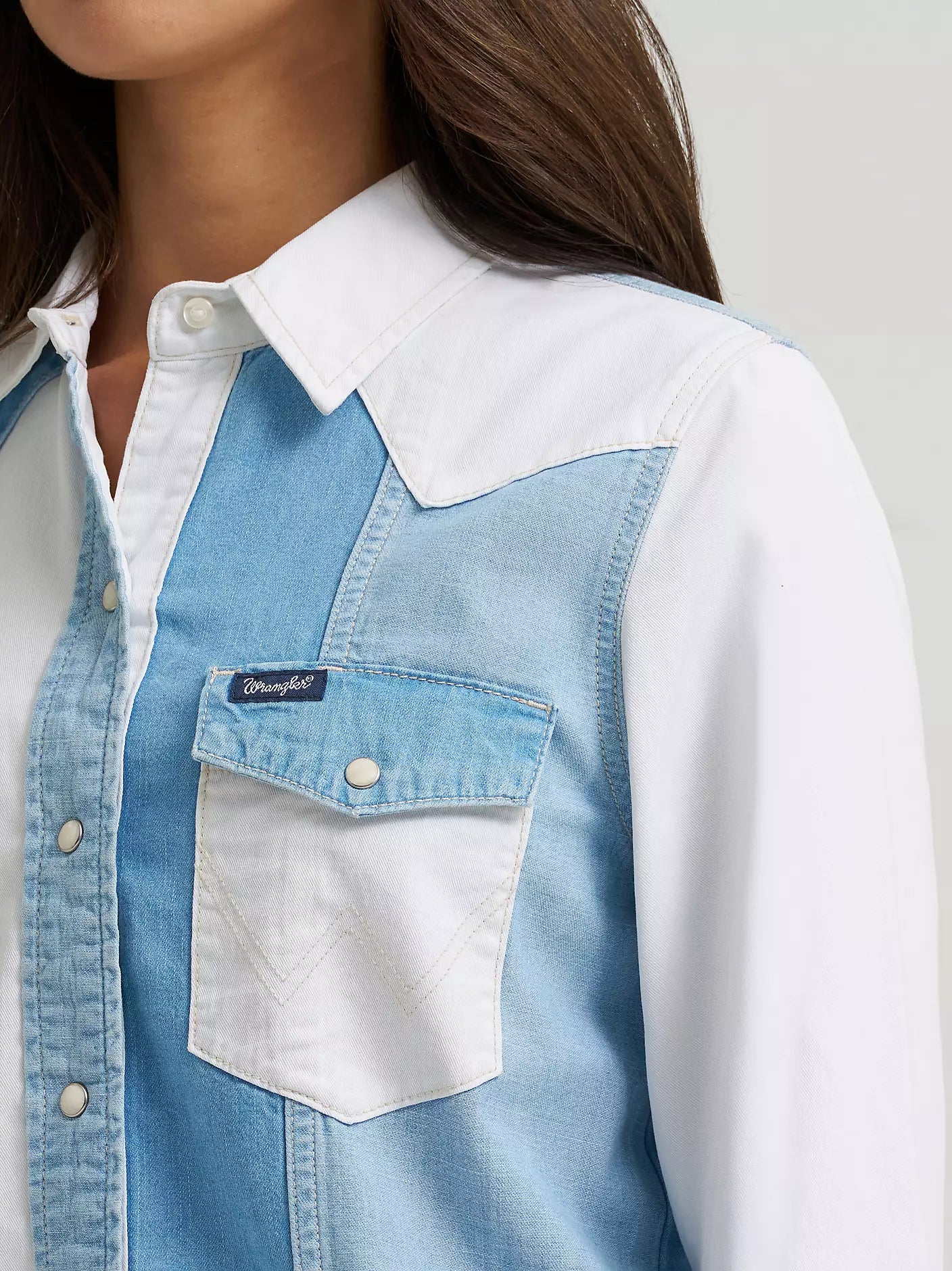 Triple the denim, triple the style with the Wrangler Retro® Boyfriend Denim Snap Shirt. Designed with panels of denim in multiple washes for a color-blocked look, this bold piece delivers standout Western authenticity with a modern twist. Made of 100% cotton for nonstop comfort, this classic snap shirt’s cut in a relaxed, vintage-inspired fit that feels as good as it looks. The best part? It pairs effortlessly with anything—because when you walk in wearing this shirt, you’re guaranteed to make an entrance.