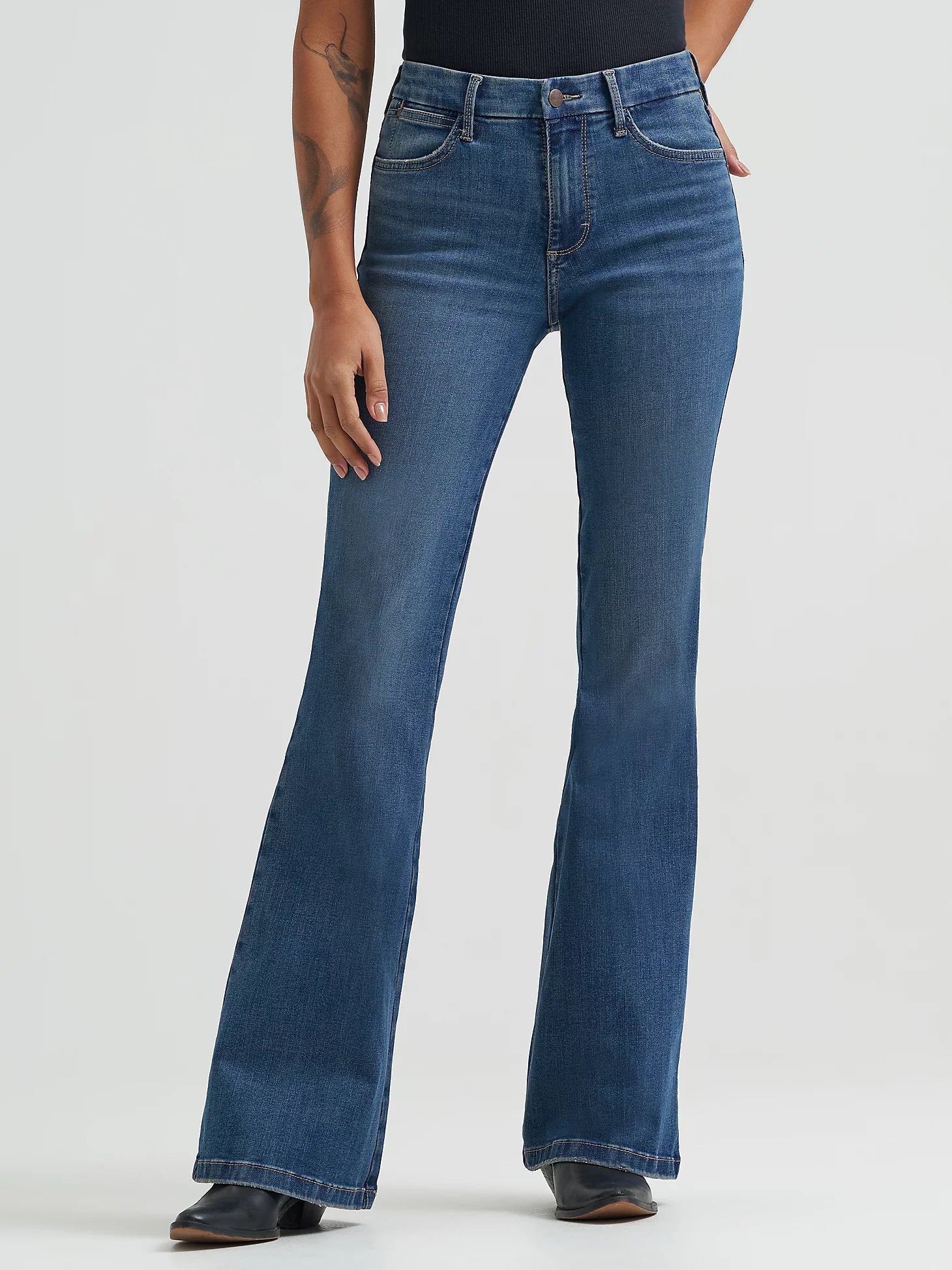 Turn up the volume and give those curves the love they deserve with our Women’s Wrangler® Bespoke High-Rise Flare Jean. We've made the vintage-inspired style even more flattering with a silhouette and angled back pockets to accentuate your shape. These new and improved bell-bottoms also come with a contoured waistband that eliminates gapping. Plus, the signature “W” pocket stitching and logo patch for an extra dose of authenticity. The Wrangler Bespoke Collection features superior stretch and detailing, so finding the right fit is no longer a wild rodeo.