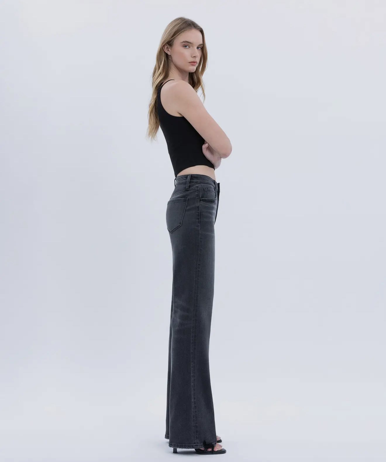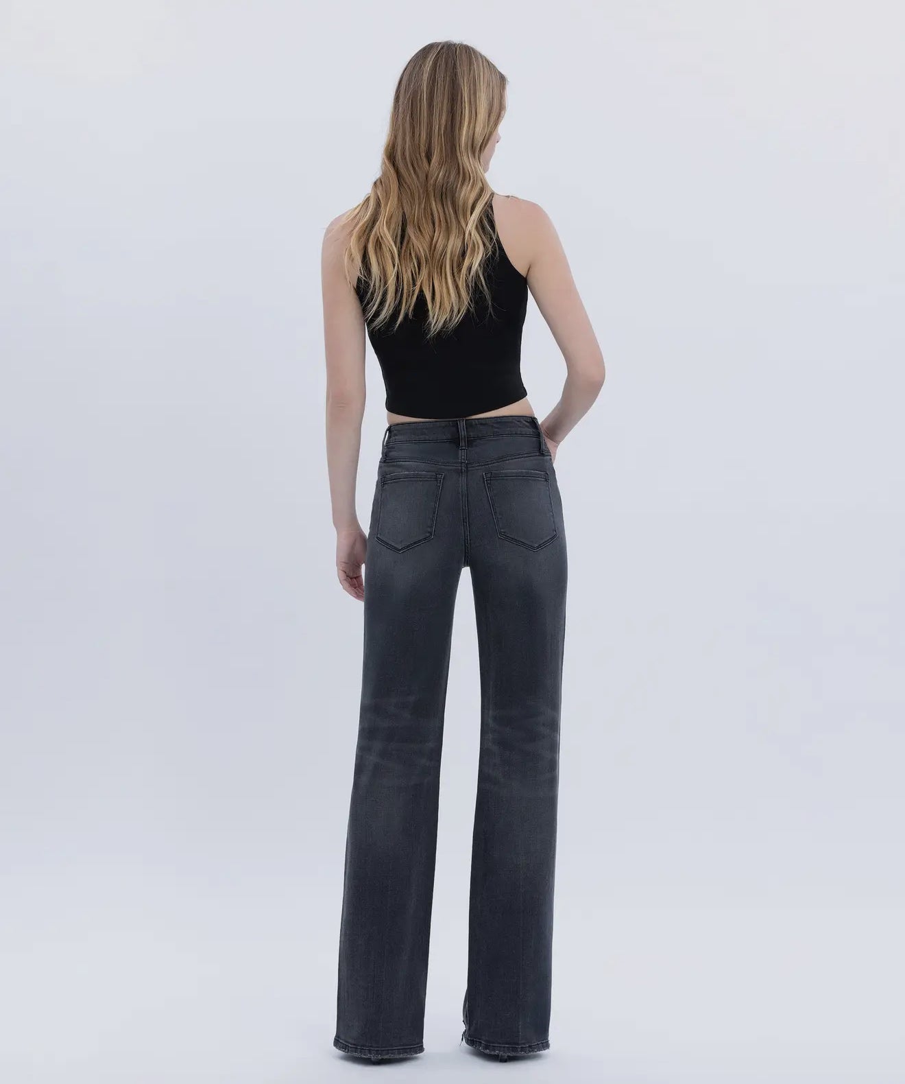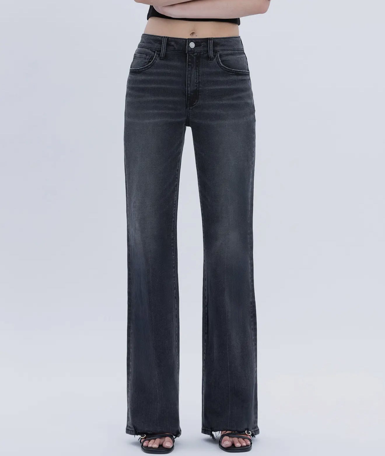 High rise vintage flare jeans Comfort stretch denim, high rise waist, distressed hem, full length, vintage flare jeans