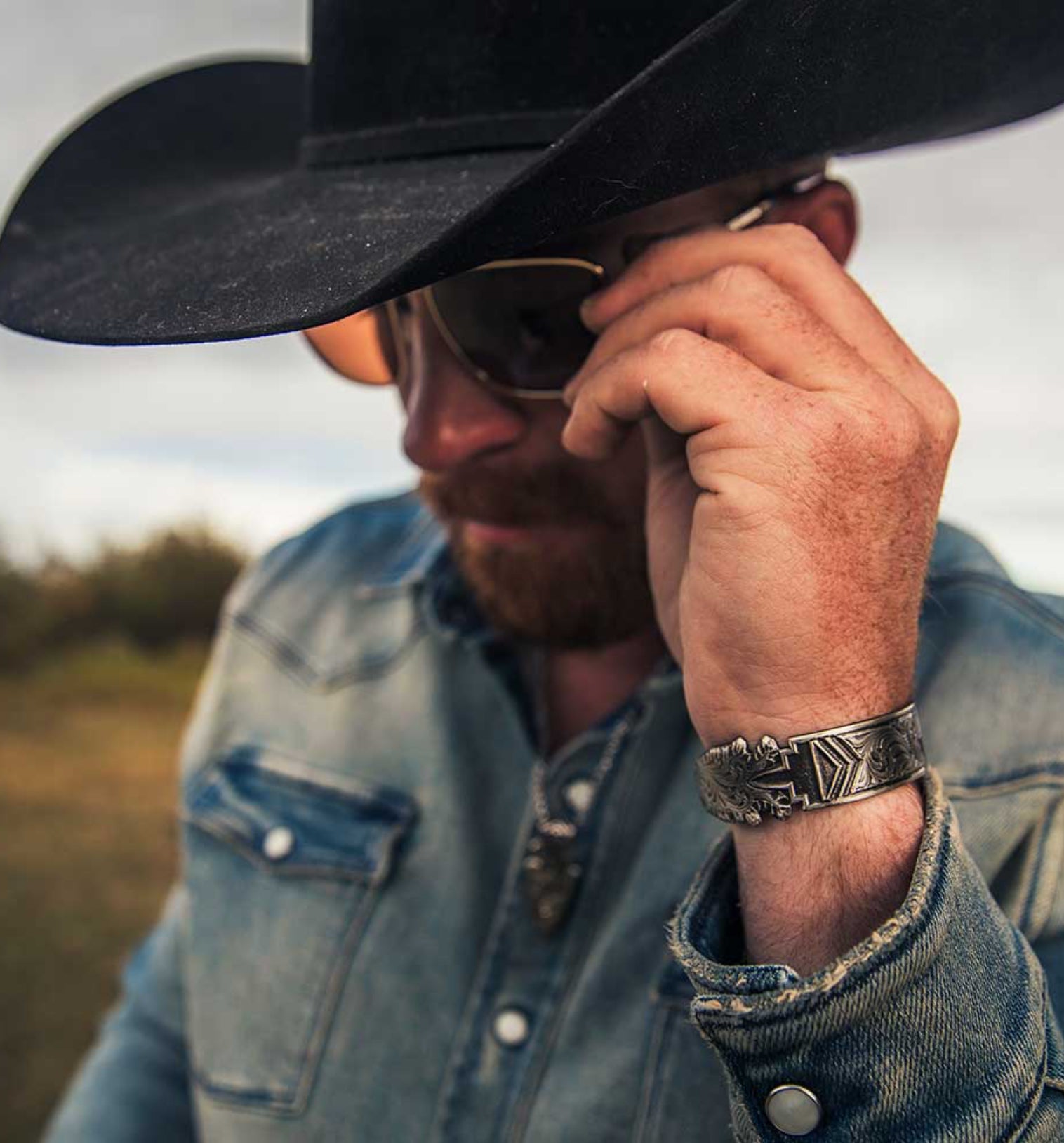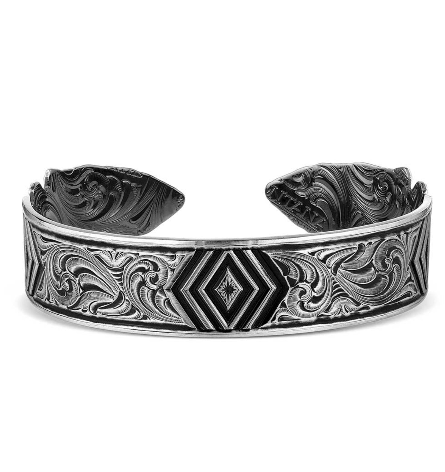 The Old West Arrowhead Cuff Bracelet has the look and feel of the American West. The dark gunmetal finish on the piece gives it a worn and bold look. The cuff bracelet features classic engraving on the back and a diamond shaped pattern. At the front of the cuff are two detailed arrowheads, the engraving from the back continues onto the arrowheads and a chiseled edge gives them a realistic look. One size fits most.