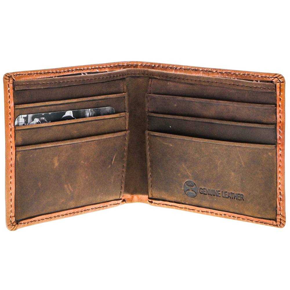 This Hooey bifold wallet features hand-tooled leather detailed with heat branded 2.0 hooey logo, laser cut details & turquoise leather inlay. Tan/Turquoise exterior & interior and includes our custom hooey brands woven logo liner.