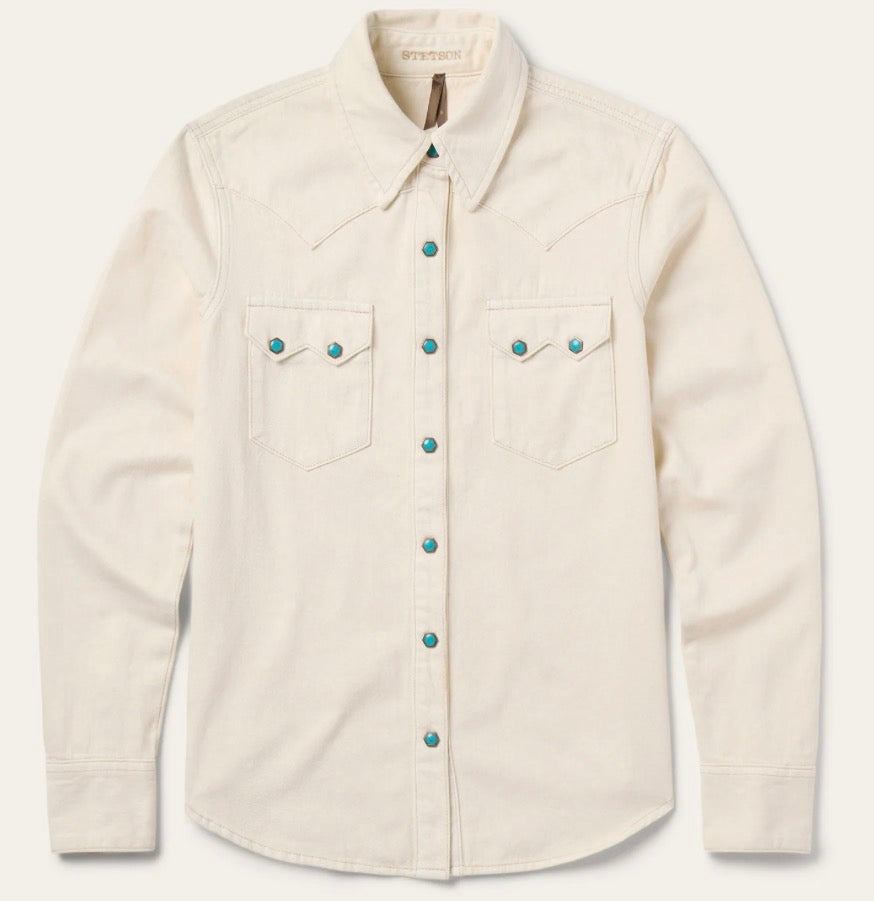 This premium western shirt is crafted from rugged, durable 100% cotton denim and features signature turquoise hexagon snaps with copper rims that are designed to make a statement wherever you go. Its authentic style details include deep curved front yokes, a two-point back yoke, two patch chest pockets with sawtooth flaps and snap closure, subtle Stetson embroidery on the chest and right cuff placket, a classic snap front and three-snap roper cuffs (originally invented as a convenient way for cowboys to roll up their sleeves while roping cattle). Constructed with triple needle stitching for toughness, it has a classic loose cut that allows for freedom of movement, and like all of our true blue denim shirts, it will only get more comfortable with time and wear.