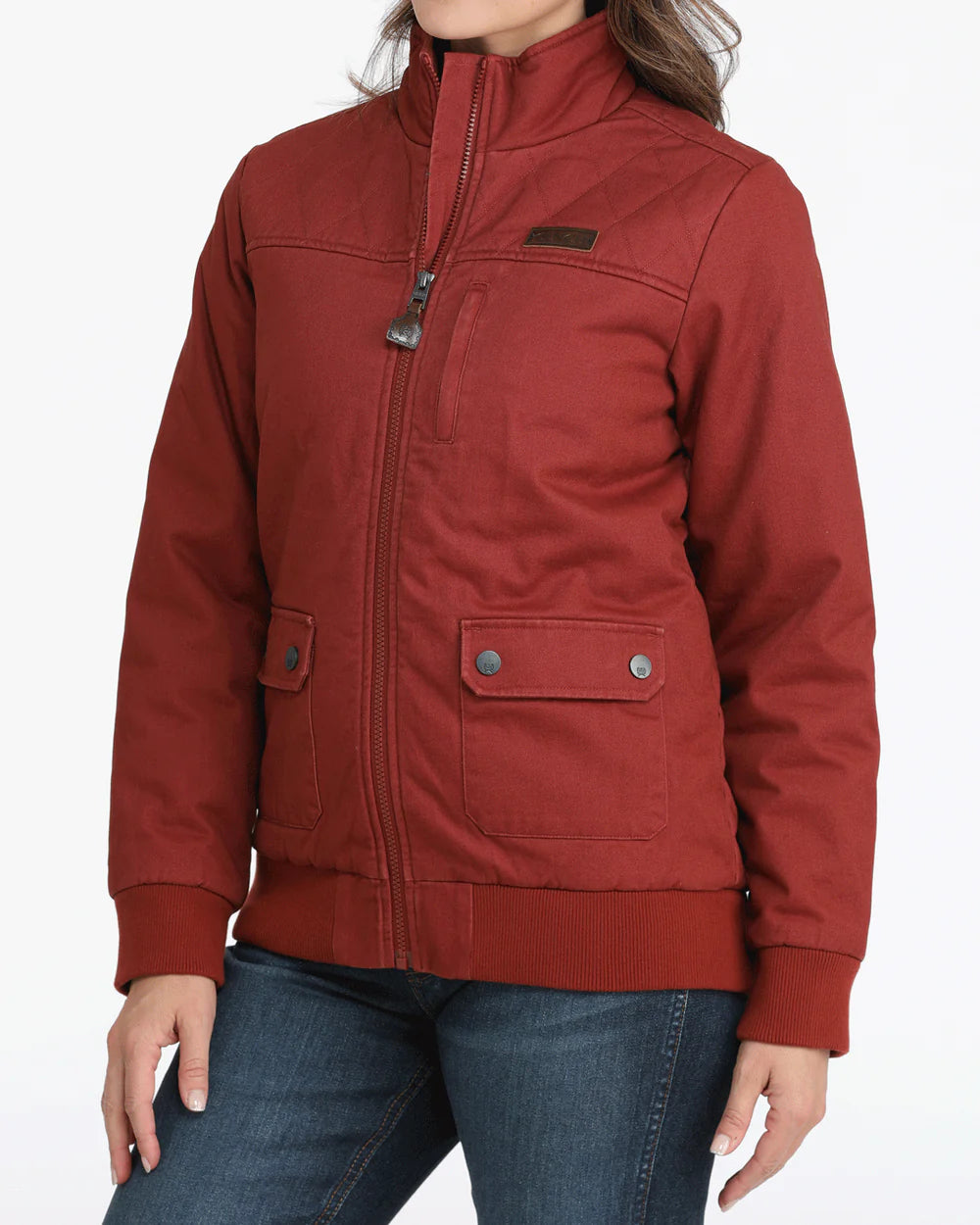 Make plans to include this red bomber jacket in your fall outerwear collection and breeze through the blustery days ahead. This cotton twill canvas essential features quilted yokes, rib knit trim, handy pockets, a leather CINCH logo patch, and Durable Water Resistant (DWR) finish.