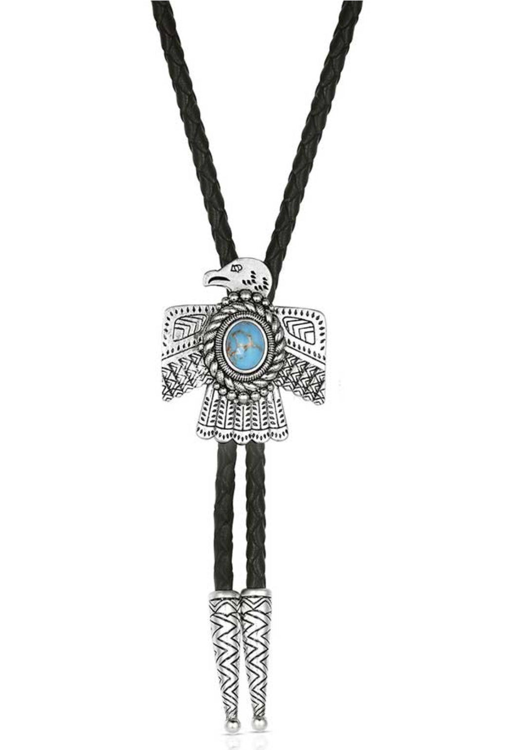 This bolo tie features a thunderbird with black antiquing to make each of the birds features pop. In the center holds a crafted turquoise stone. Black braided leather cords are weighted with two silver tone pointed tips. Stone color will vary.