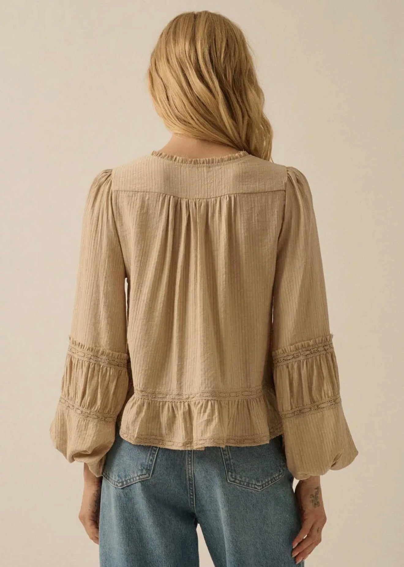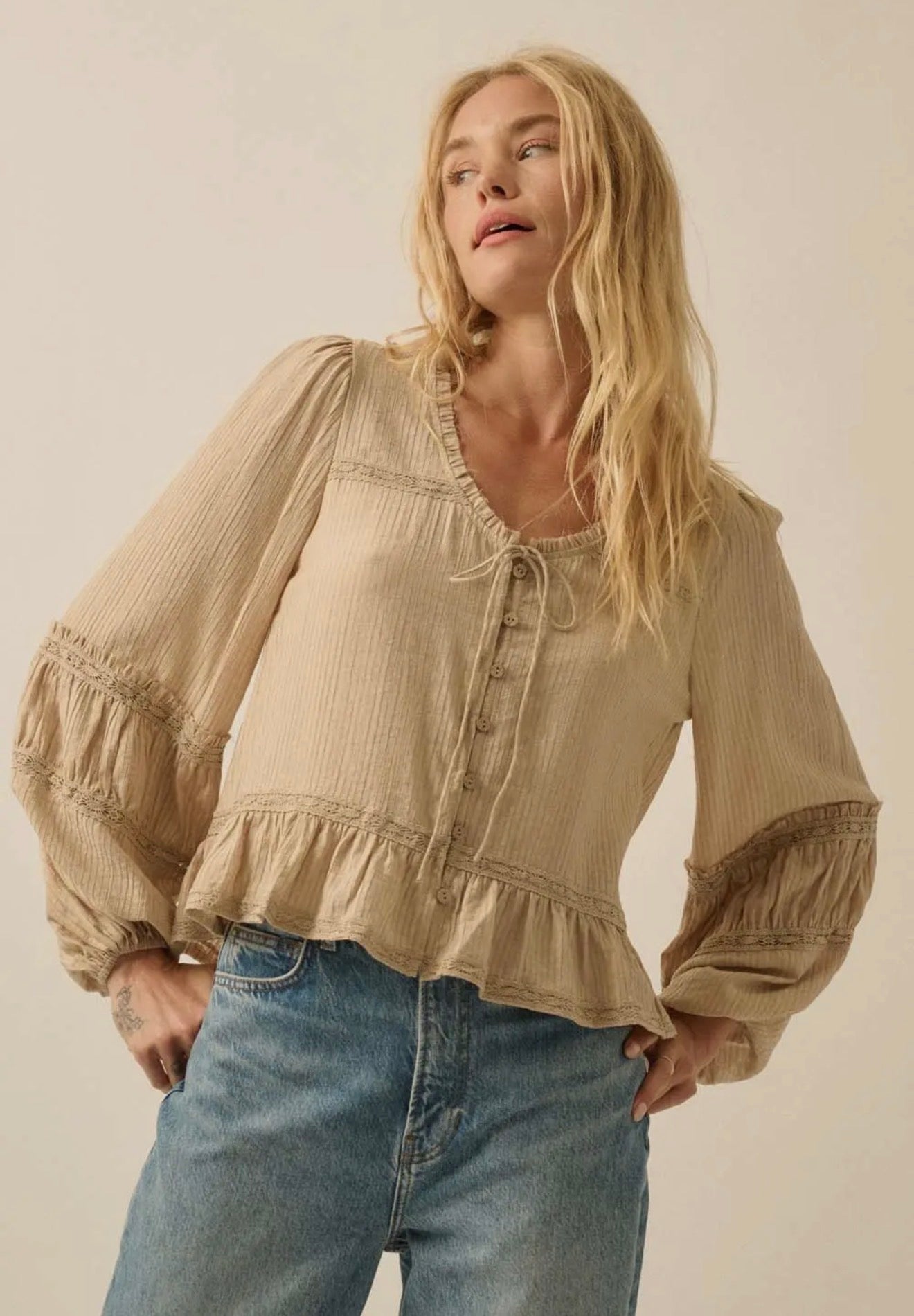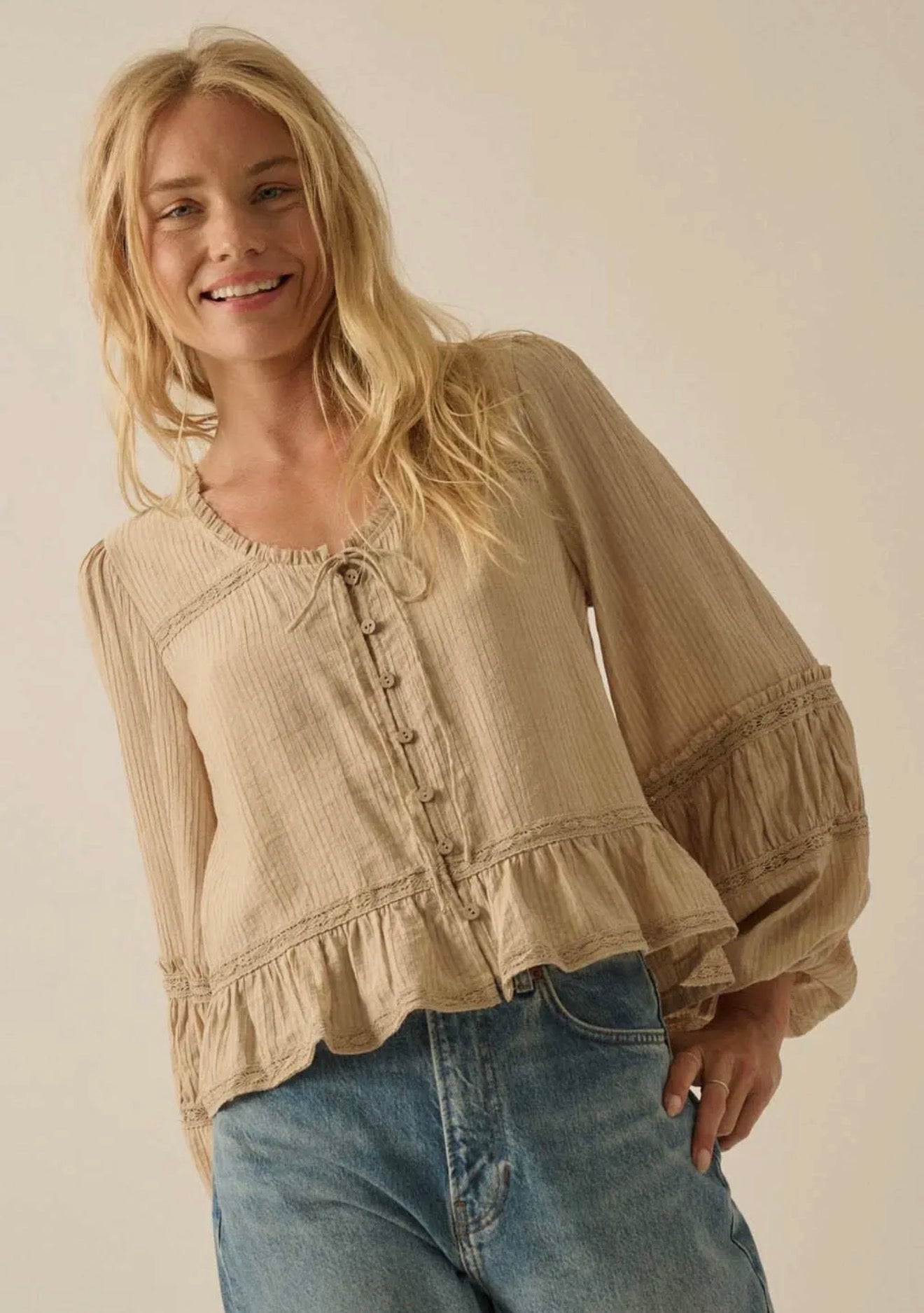 A tonal-stripe woven peasant top with the following features: Scoop neckline with raw-edge ruffle and tie detail. Button-loop front closure with coconut wood buttons. Lace trim throughout. Long balloon sleeves with elastic cuffs and raw-edge ruffle trim. Ruffle hem. Yoke back. Cropped length. Relaxed fit.