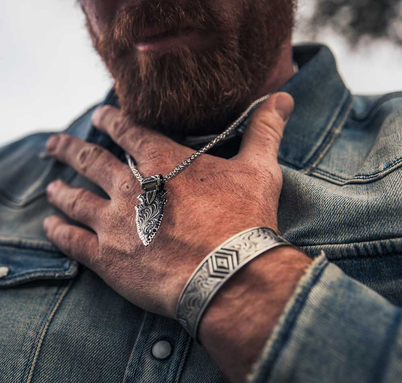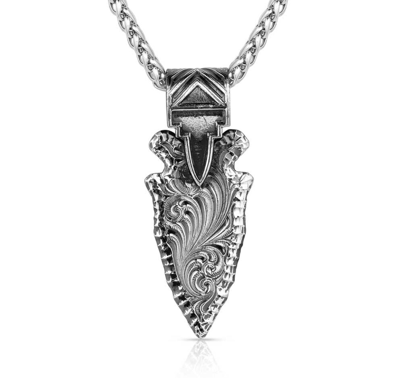The Old West Arrowhead Necklace is a great design for your collection. The pendant is a gunmetal arrowhead with detailed Western engraving and a chiseled edge gives the piece a realistic look. The arrowhead is secured by a bold bail with a Southwestern etching, to a 22 inch silver tone wheat chain.