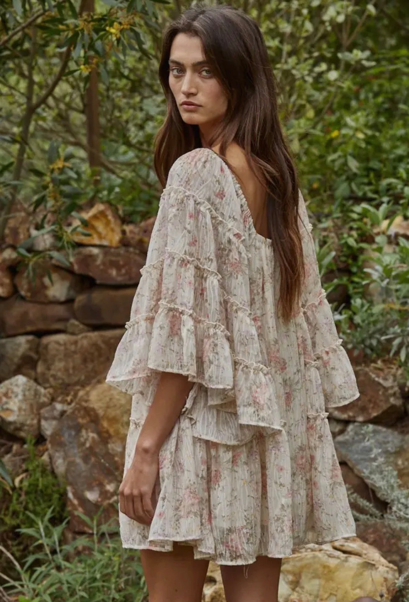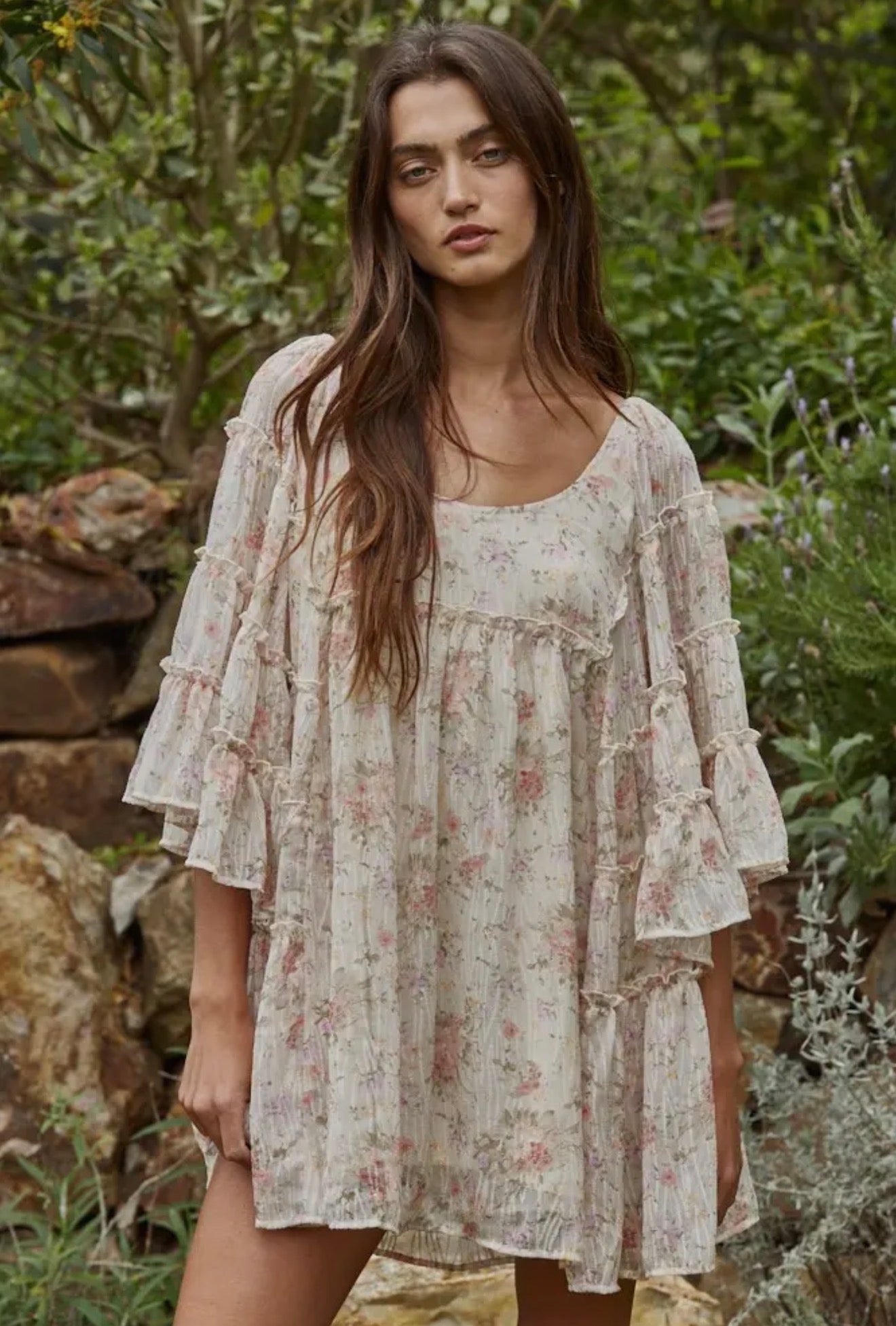 This chiffon mini dress features a flattering scoop neckline, flowy flared sleeves, and ruffle trim details — fully lined and perfect for fall days, date nights, or styled with boots for that effortless Branded look! 🤍