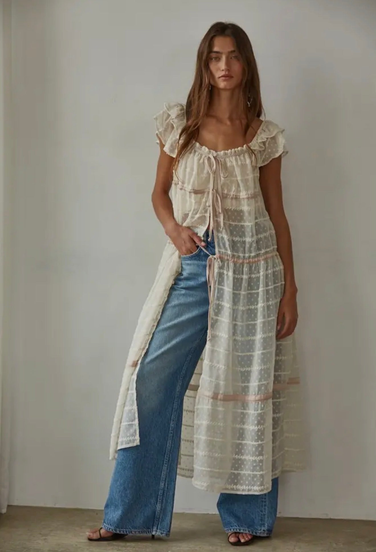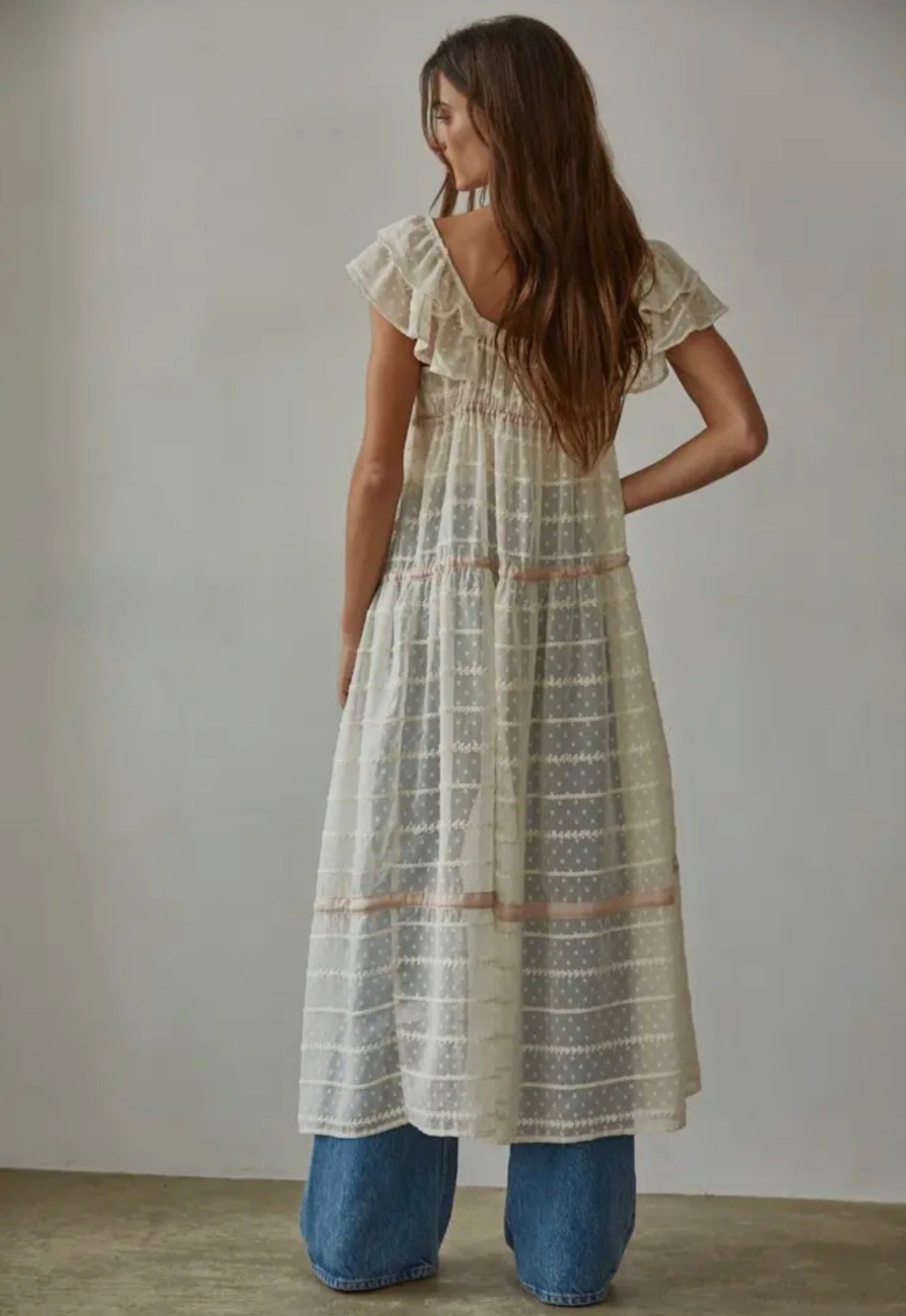 This swiss-dot chiffon maxi features a flattering sweetheart neckline, ruffled sleeves, and delicate front ties for the perfect flowy Western-meets-feminine moment 🤍